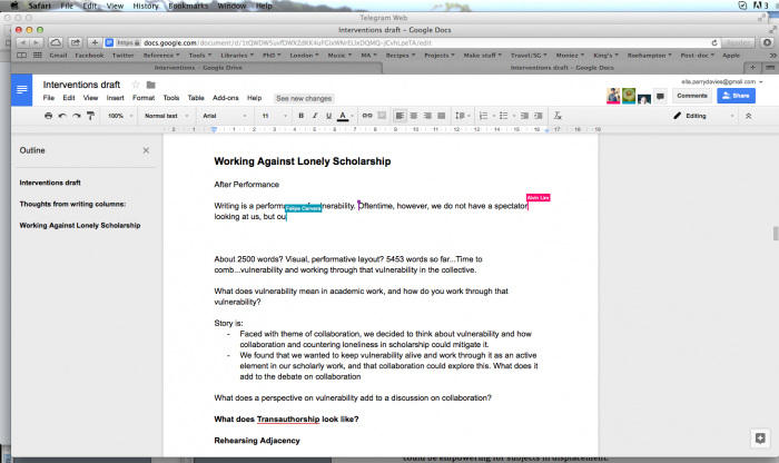 We often find ourselves in conversations where one or more of us opens up personal and work-related anxieties; daily, in text-messages, to give one example. These types of digital environments are increasingly becoming a constituent spatialisation of friendship and family, as various forms of migration reduce the spaces of conviviality to the size and font of a now predetermined screen. The digital interface extends our faces and bodies in situ, while pointing out that there are still fingers that type, erase and are inevitably limited when we try to concentrate for hours on a single piece of writing. Collaborative writing digitally performed, then, highlights both our physical limitations, as well as the flights that we can make across time and space, albeit slowly.