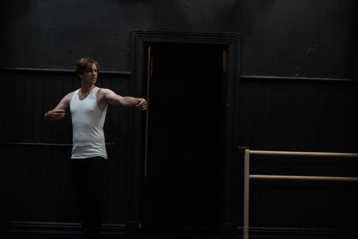 The work begins with a ballet warm-up at the barre; a fixed form of exercises, which David taught me in our time together rehearsing the work. We are dressed identically in black tights, white singlets and ballet shoes that we purchased together, although David is probably a foot taller than I am and towers over me on stage. Light piano music, possibly from Tchaikovsky’s score to Swan Lake, plays over our barre warm-up, and I address the audience.